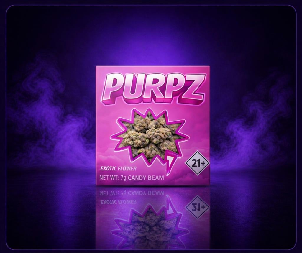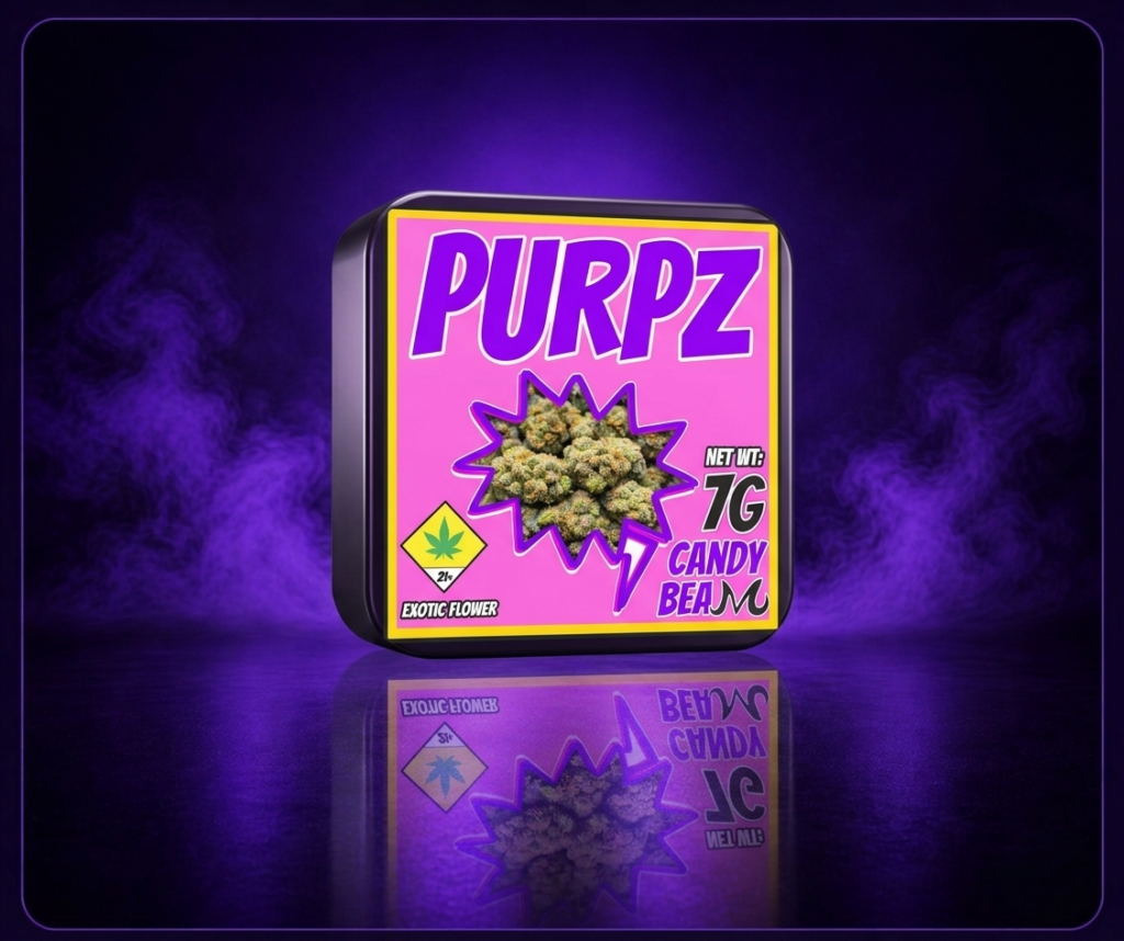 Candy Beam Purpz is a premium exotic flower featuring dense, high-quality buds with a rich appearance and smooth consistency.